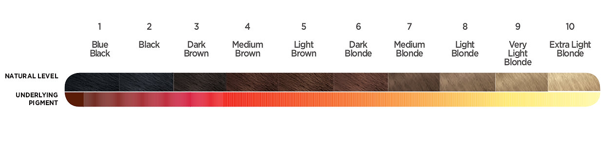 To understand how toner works, let us use a little bit of chemistry to explain. We have two main types of pigment in our hair: eumelanin (brown to black pigment) and pheomelanin (yellow, orange to light red pigment). During the bleachning process, eumelanin is removed, while pheomelanin is only minimally affected. As a result, dark hair turns yellow because a large amount of pheomelanin remains in the hair. In contrast, lighter hair that have less of feomelanine, turns light yellow. Therefore, whenever you decide to lighten/bleach your hair, you will always fight warm tones (see picture below), especially when we lighten by more levels and the original hair colour is dark. This is where a hair toner comes in handy.