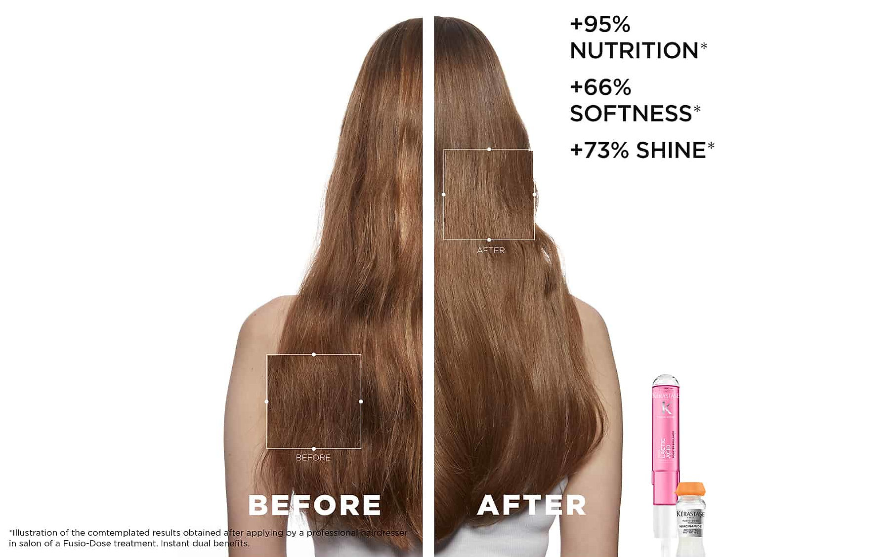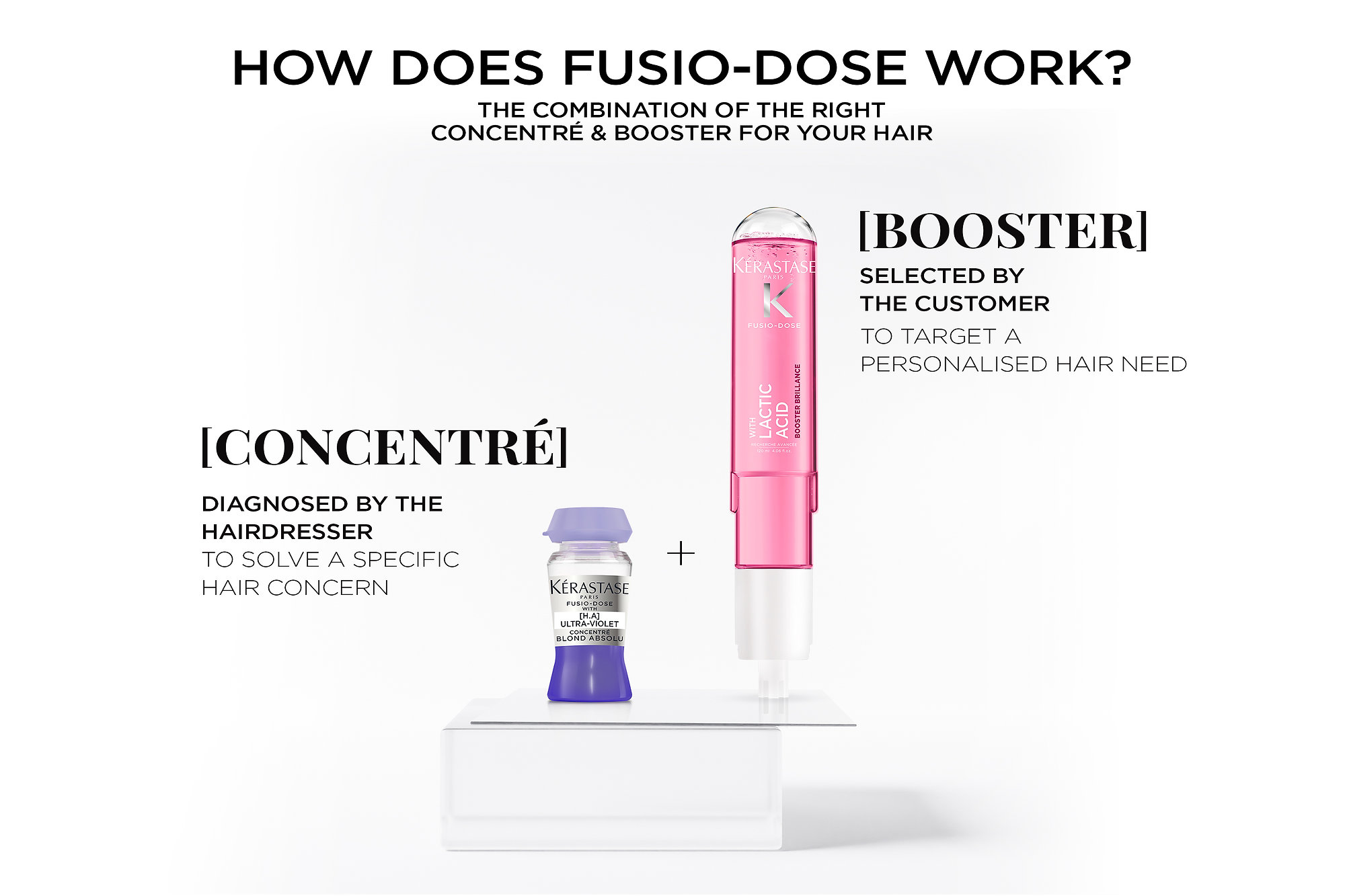 Fusio-Dose transforms your hair in less than 5 minutes with a custom-blended blend. The combination of booster & concentré offers 30 different combinations that address 2 hair needs in 1 application! The Fusio-Dose Concentré concentrated treatments target the primary hair need identified by your hairdresser after diagnosis, while the Fusio-Dose Booster boosters target the secondary hair need your client is seeking, so you can have the best of both worlds.